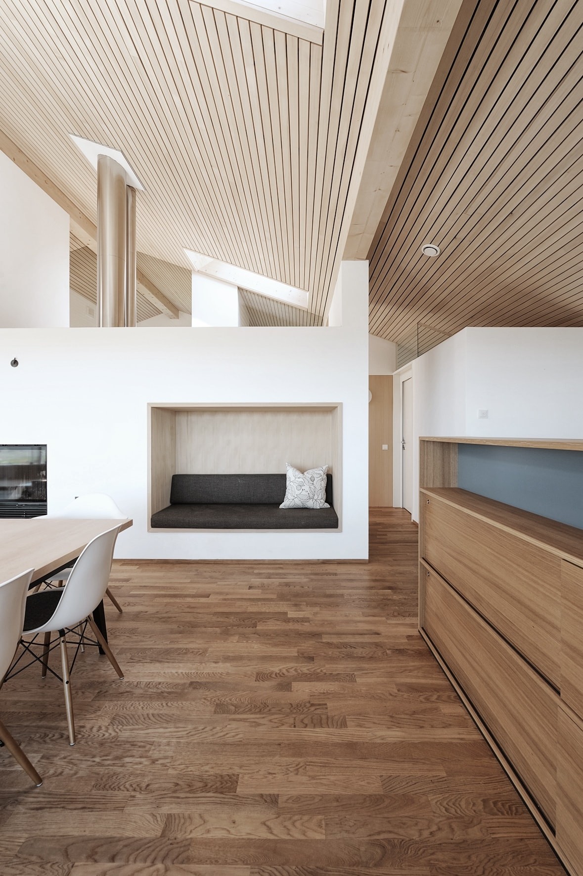 Zur Optimierung der Grundrissfläche wurde der Dachstuhl um ca. 70 cm angehoben. Der offene Grundriss mit eingestellten Raumzellen für Zimmer und Nebenräume war inspiriert durch die luftige Lage im zweiten Obergeschoss.