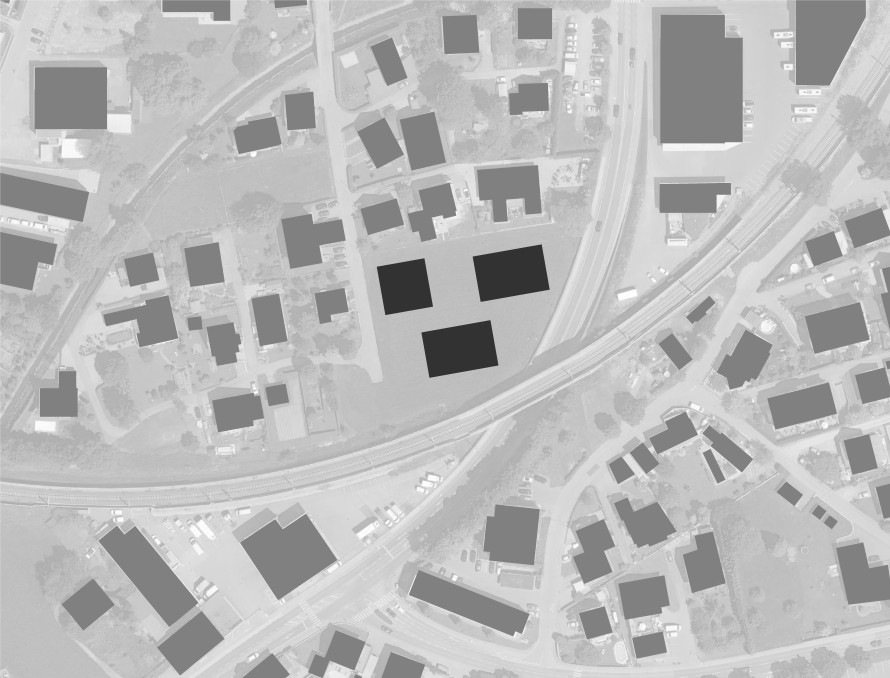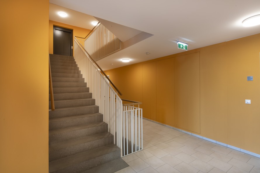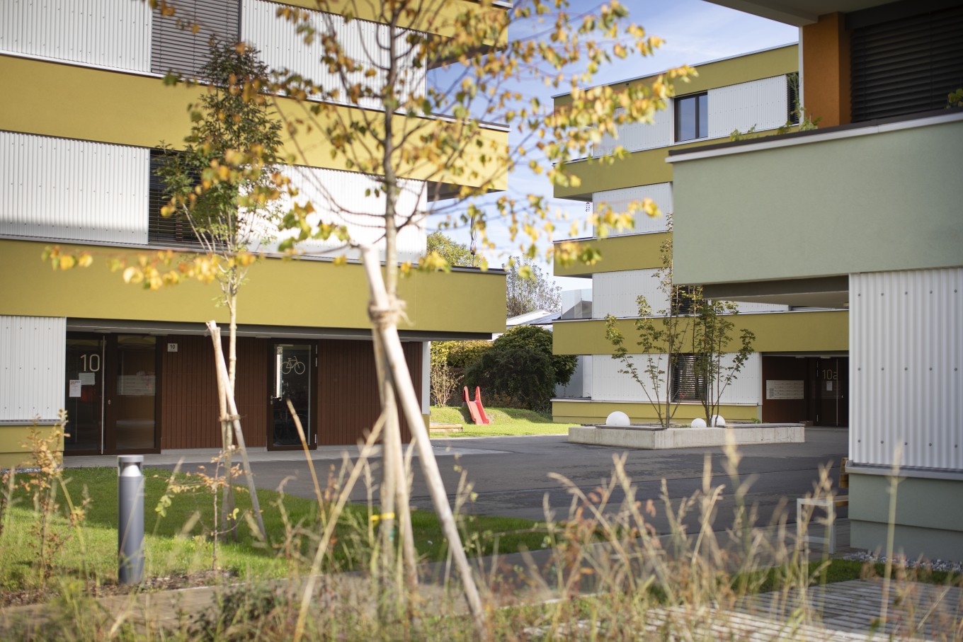 Die Aufteilung auf drei Baukörper reagiert auf den Maßstab der Umgebungsbebauung. Diese Gliederung ermöglicht ein gleichermaßen wirtschaftliches Erschließungssystem wie eine räumlich interessante Strukturierung der Freiräume. Die Gliederung des Außenraumes in einen öffentlichen Platz, einen zentralen Hofraum und die peripheren Spielflächen bietet trotz der hohen Nutzungsdichte räumliche Vielfalt und ermöglicht den Bewohnern ein konfliktarmes Nebeneinander.